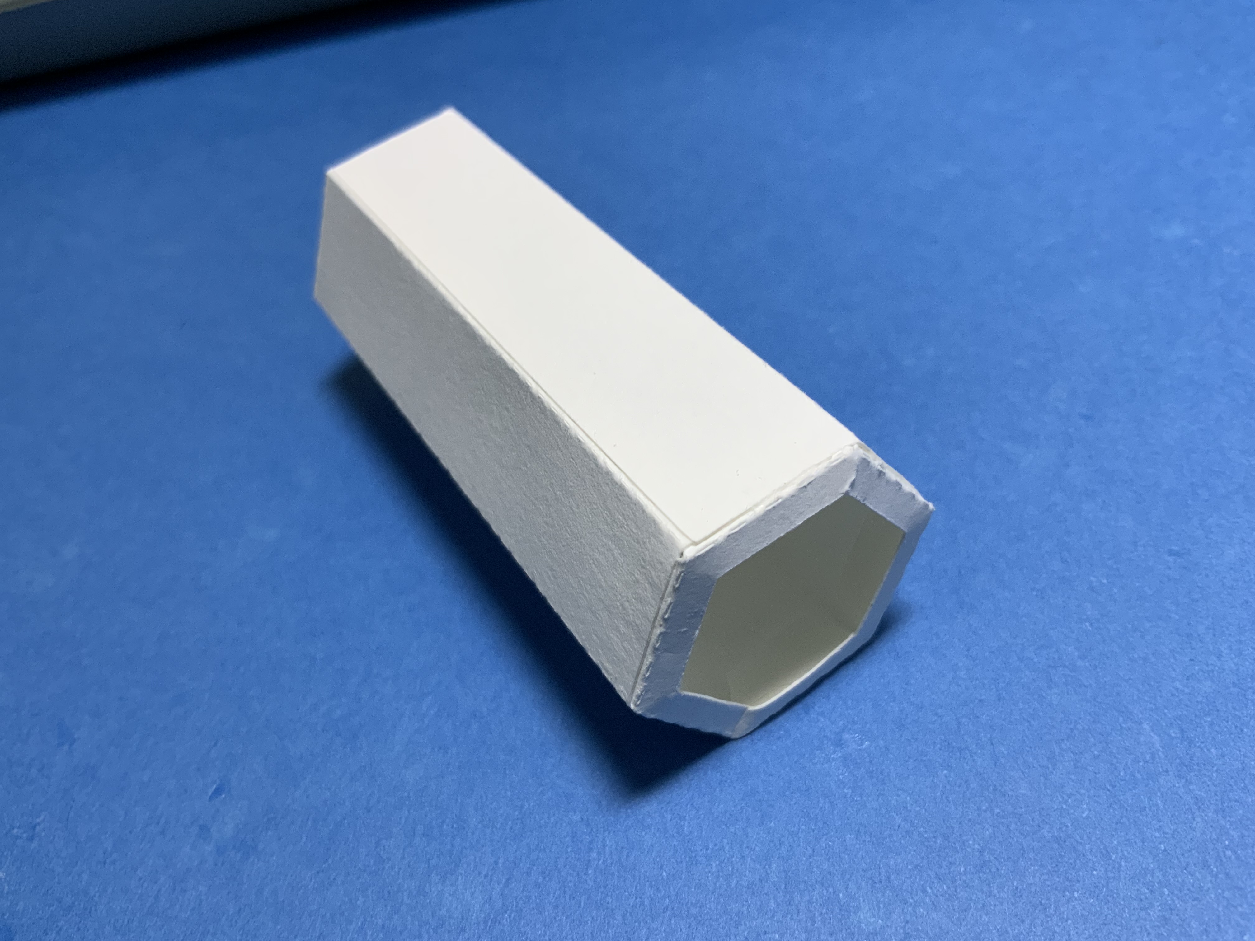 The eyepiece tube can be folded flat so that the glue will adhere properly. (Shown in the photo above on the left.) Do not leave it in this position for too long as glue might have entered the center of the tube and adhere it together. Once each tab has adhered, make the tubes into a hexagonal tube.